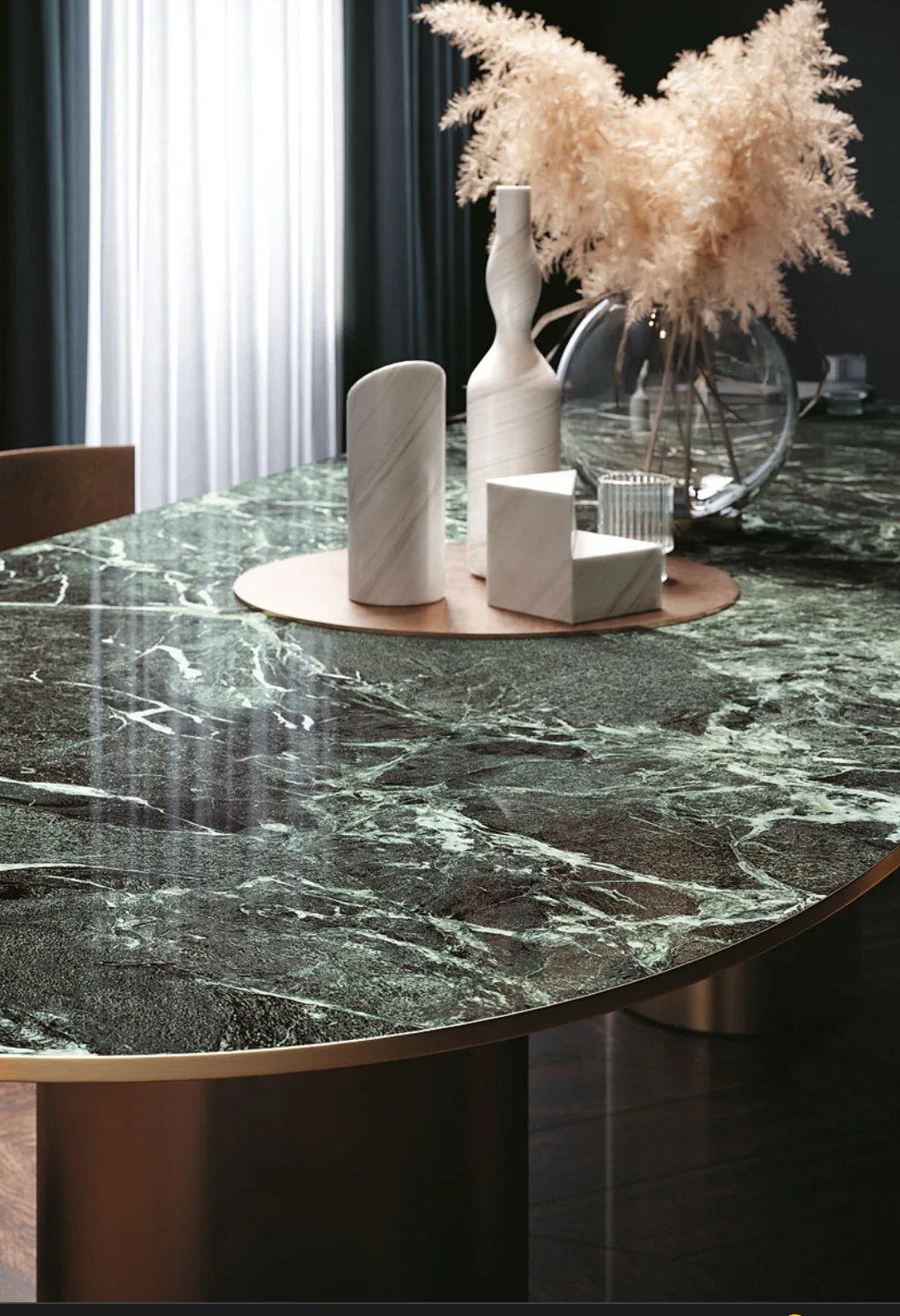 Verde France offers a refined reinterpretation of French green marble, featuring natural veining and a sophisticated texture. These technical porcelain slabs combine chromatic elegance with resistance and versatility, making them ideal for wall cladding, design flooring and bespoke countertops in luxury interiors.
