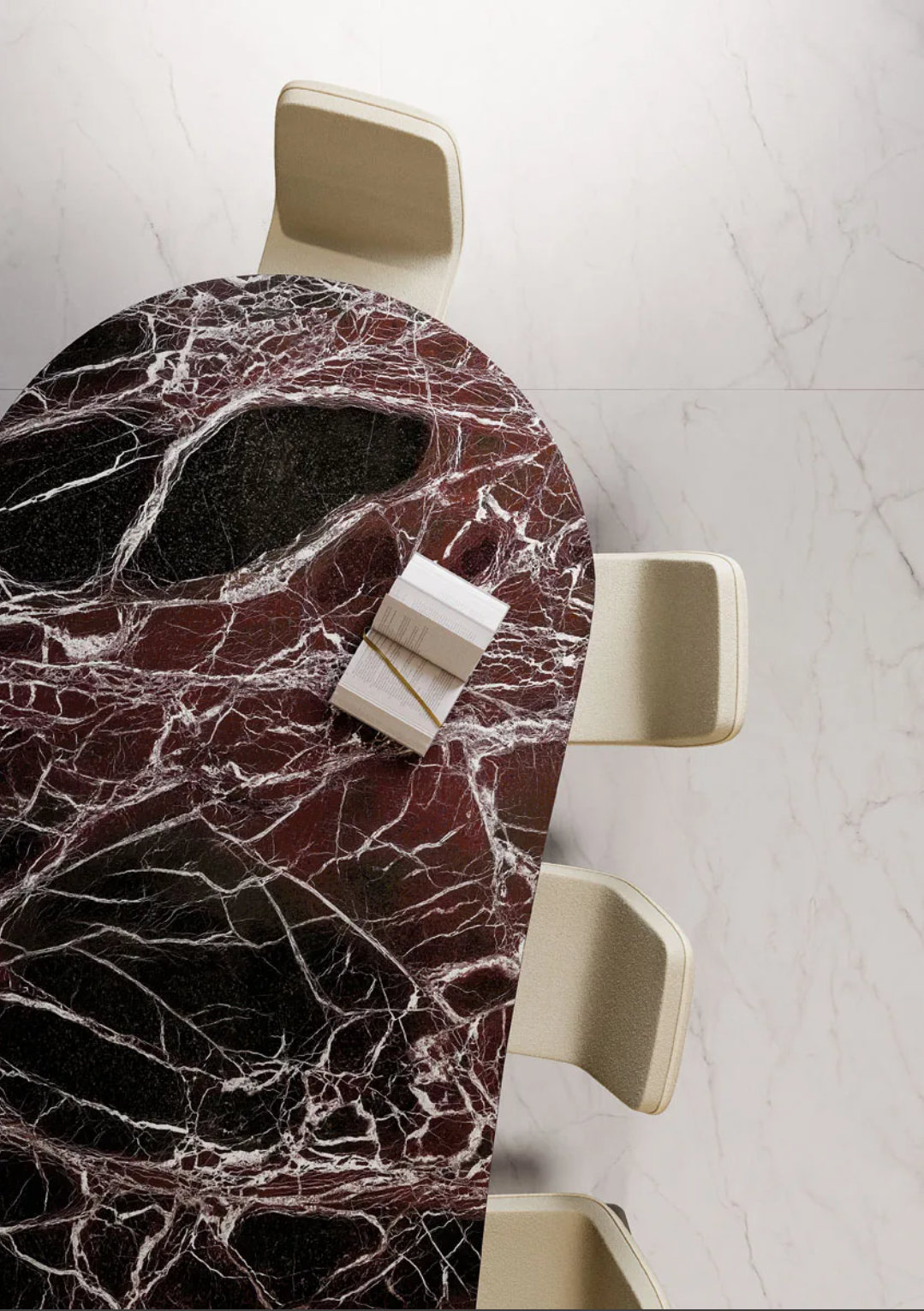 Rosso Domus is inspired by Verona red marble, with an intense terracotta coloration crossed by white and copper veining. A surface that recalls the tradition of classical Italian architecture, perfect for representative interiors, boutique hotels and spaces that aim to convey personality and prestige.