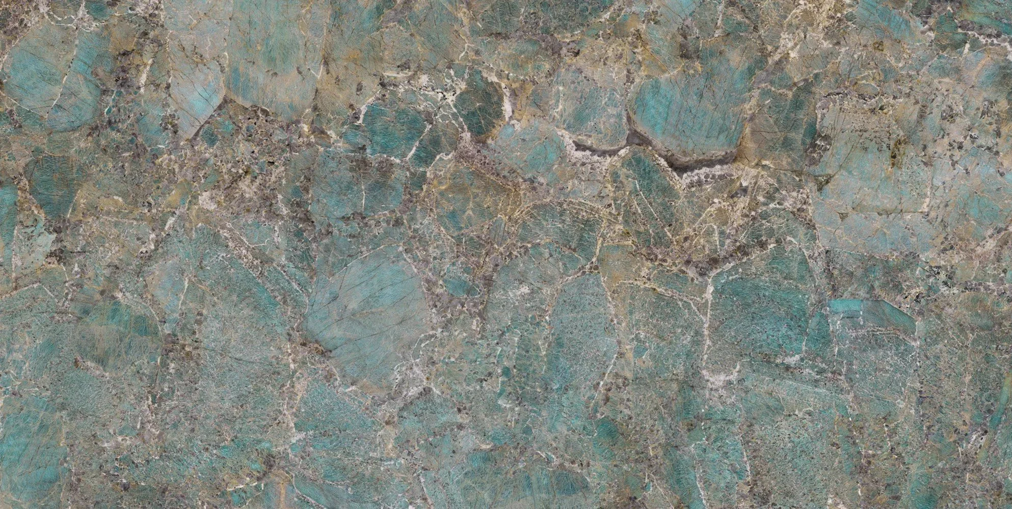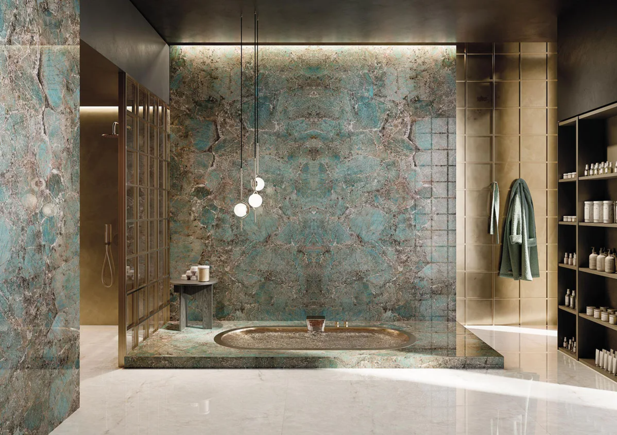 Santos reinterprets the translucent beauty of onyx in a refined chromatic combination of honey and golden tones set against a rich, deep green background. The flowing veining generates elegant reflections and an enveloping brightness. Infinity large-format porcelain slabs give this surface a sculptural, decorative effect, ideal for exclusive interiors that aspire to distinction through style and material refinement.