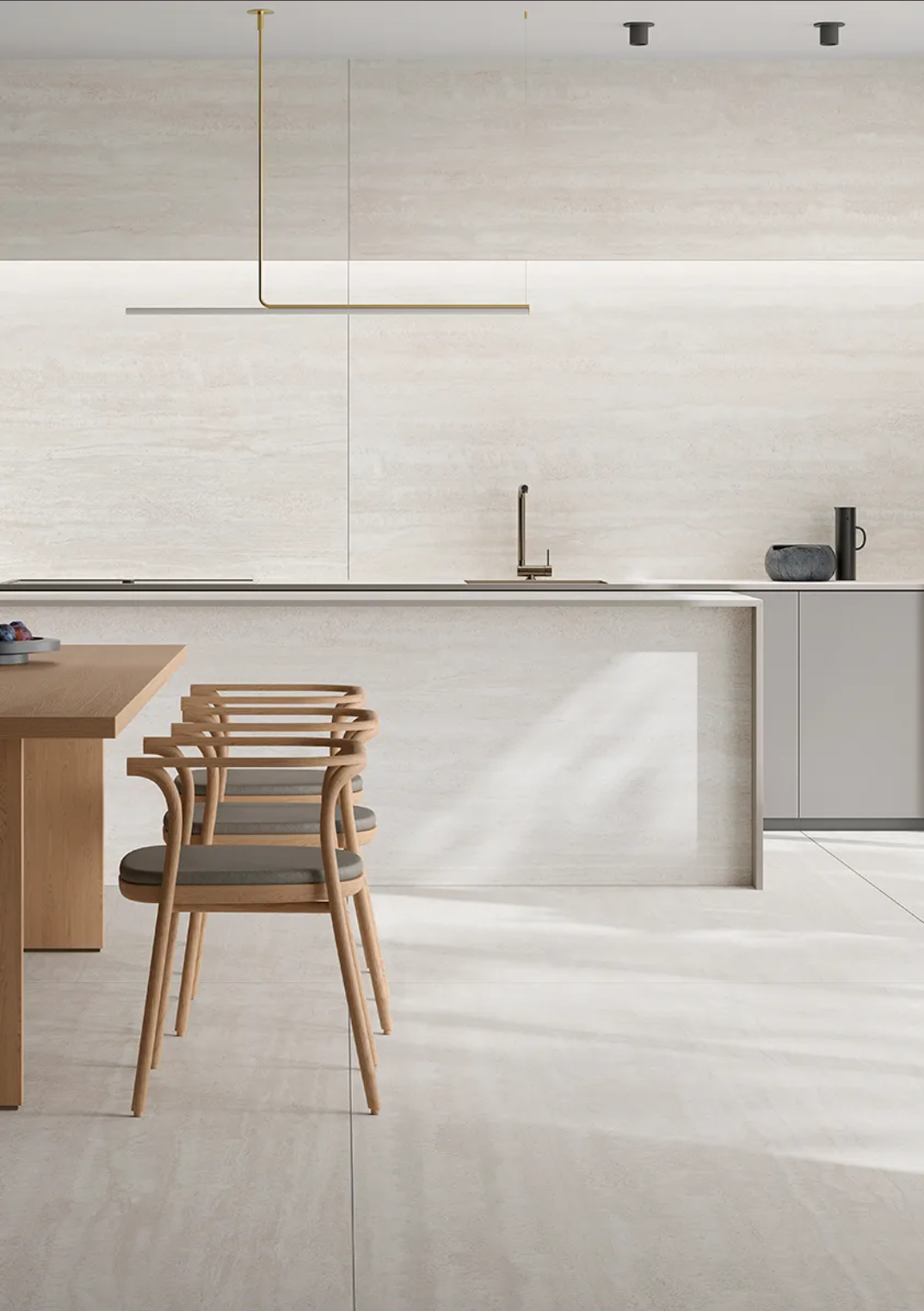 Travertino Bianco reinterprets the elegance of classical stone in a bright, sophisticated version. With its soft ivory tone and subtle veining, it brings a noble, exclusive character to interiors. Infinity large-format porcelain slabs ensure visual continuity and refined aesthetics, perfect for spaces demanding sobriety, prestige, and timeless elegance.